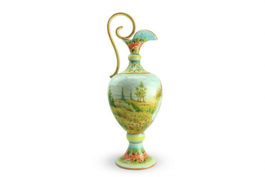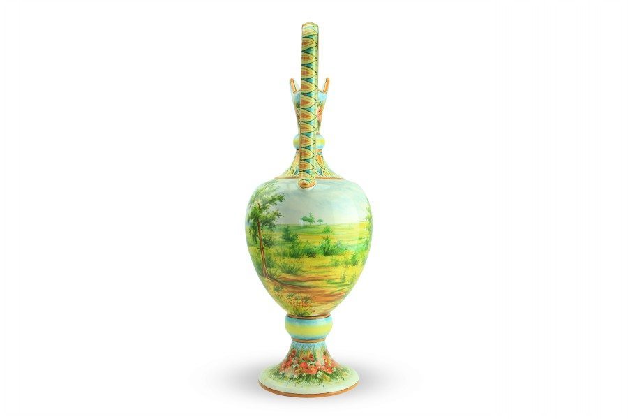 L’anfora in ceramica maiolica italiana è realizzata e decorata a mano nel rispetto della migliore tradizione nella lavorazione artigianale della ceramica abruzzese. Le maestose linee classiche della forma e la rappresentazione del paesaggio naturale e della Mietitrice veneta di Cascella, rendono il manufatto un’opera unica, simbolo per eccellenza della ceramica italiana tradizionale.