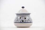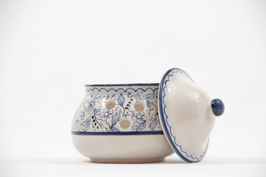 Il barattolo per aglio in ceramica artigianale è un contenitore in maiolica in stile tradizionale di altissima qualità, utile, comodo e raffinato, adatto ad ogni cucina. Il contenitore è facile da pulire con un panno umido, ma può essere lavato anche in lavastoviglie a max 60º. L’oggetto è realizzato in argilla rossa,  foggiato e rifinito a mano, colore dello smalto bianco antico, decorato a mano. I fori presenti permettono di tenere sotto controllo il livello dell’umidità all’interno del barattolo il che diminuisce il rischio della formazione delle muffe e quindi la creazione di cattivi odori. Al momento dell’acquisto, al prodotto verrà allegato il Certificato di garanzia che attesta l’artigianalità della lavorazione.