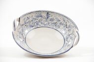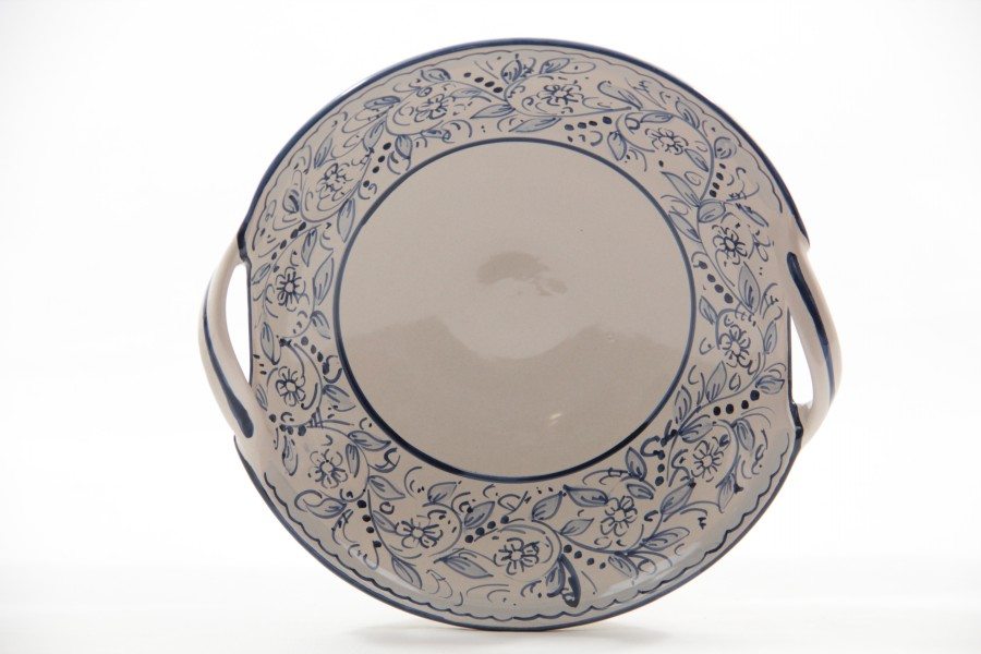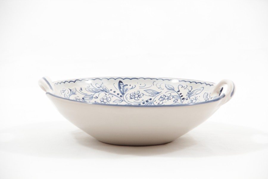 Il centrotavola in ceramica con due manici, lavorato a mano, con metodi tradizionali e materiali adatti all’uso alimentare. Lo smalto è di colore bianco antico e il decoro tipo Teate blu di Ceramiche Liberati è dipinto a mano. Tutte le fasi del processo di realizzazione del centrotavola, dalla foggiatura alla decorazione, rispettano la migliore tradizione della lavorazione della ceramica artigianale italiana.