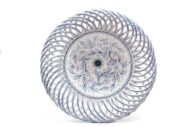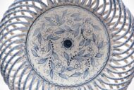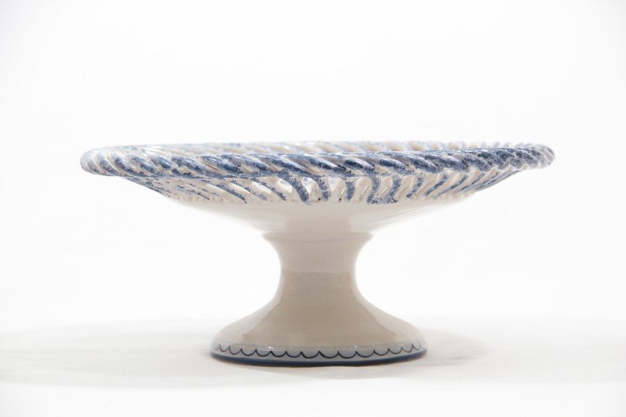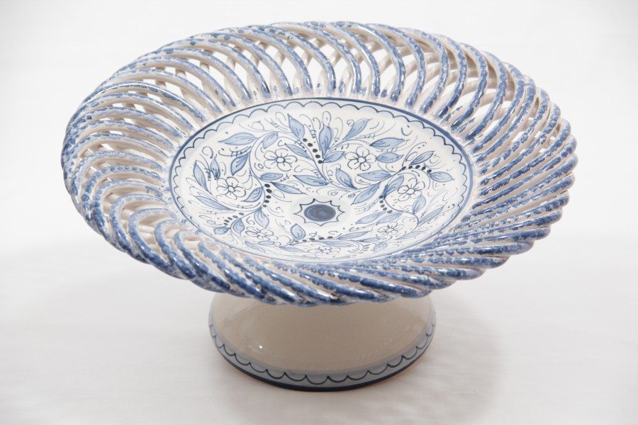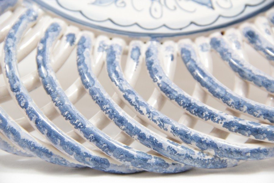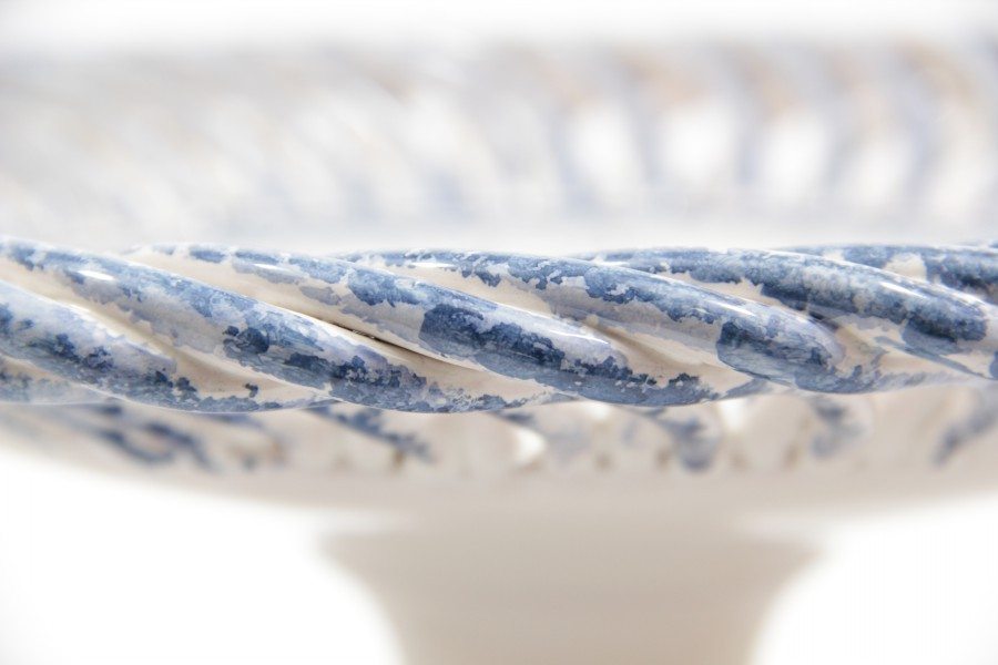 Centrotavola in ceramica intreccio con piede, decoro Teate blu