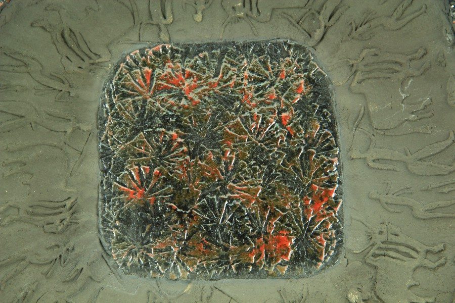 Il motivo decorativo del centrotavola è ispirato all’arte rupestre, che riprende i segni e i disegni realizzati dall’uomo Sapiens nelle grotte e sui muri nel periodo preistorico; all’epoca spesso questo tipo di disegni era realizzato a rilievo, inciso o scolpito sulla pietra. Una volta rifinito il decoro, il centrotavola è stato decorato nella parte centrale e sui bordi esterni, con smalti dalle tonalità del rosso e del nero metallico. La colorazione evidenzia perfettamente le incisioni, valorizzando ogni minimo dettaglio, mente la parte con le incisioni rupestri è stata lasciata al naturale, per dare risalto alla particolare colorazione nera dell’argilla.