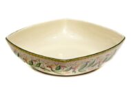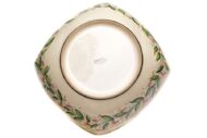 La Ciotola da portata quadrata in ceramica artigianale è stata realizzata e decorata a mano, con metodi artigianali e con materiali adatti per l’uso alimentare. La ciotola in ceramica o vassoio da portata, comoda da utilizzare anche come fruttiera, è decorata con il decoro Orchidea dipinto in larga fascia sul bordo esterno. Tutte le fasi del processo di realizzazione del piatto quadrato, dalla foggiatura alla decorazione, rispettano la migliore tradizione della lavorazione della ceramica artigianale italiana e i materiali utilizzati sono di altissima qualità.