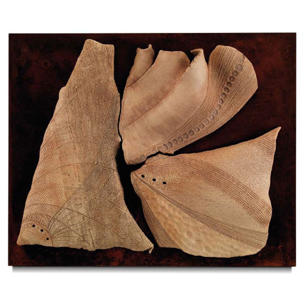 Opera materica, modellata a mano in semirefrattario bianco,pigmenti e ferro, dimensioni cm 89×72. Pezzo Unico, collezione privata.