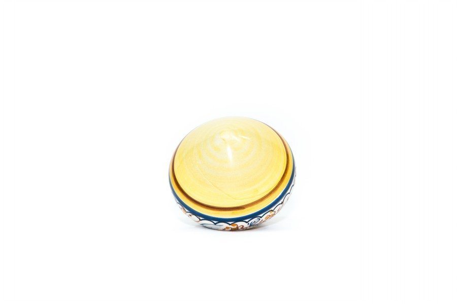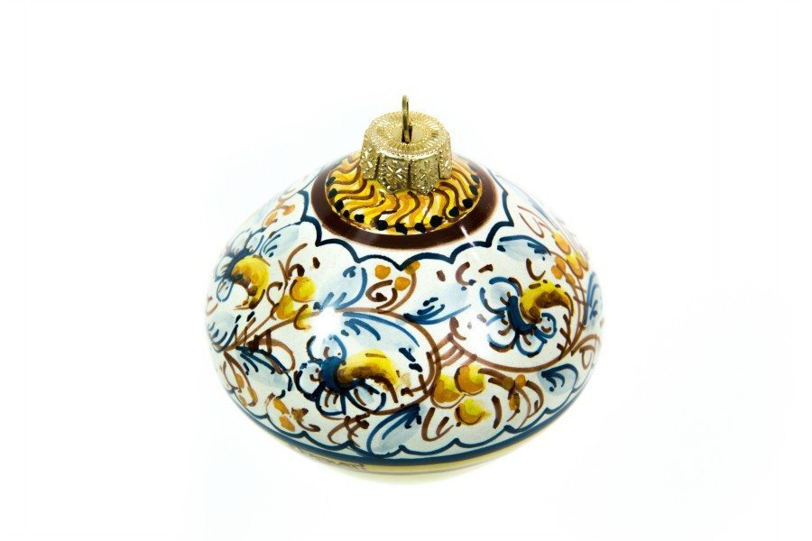 Pallina in ceramica per Natale “Trottola”, è stata dipinta a mano a pennello con colori ceramici, secondo le antiche tecniche di lavorazione della ceramica. Il decoro a colori a fascia geometrica è stato curato nei minimi particolari per rendere la pallina in ceramica un oggetto unico per il vostro albero di Natale. Il decoro a fascia geometrica rappresenta composizione di elementi floreali e lineari, posizionati lungo tutta la circonferenza della pallina. Questo tipo di decorazione per le palline di Natale è uno dei più antichi mai realizzati sulle palline in ceramica. L’abbinamento dei colori e il posizionamento degli elementi sono a libera scelta dell’artigiano che in tal modo crea decori unici che non vengono volutamente ripetuti su altre palline. La pallina in ceramica per Natale è anche un regalo unico e raffinato da donare alle vostre famiglie.