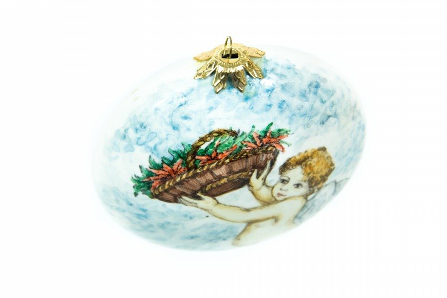 La pallina natalizia in ceramica a forma di sfera schiacciata, diametro 10 cm e di spessore 5 cm, è stata dipinta a mano a pennello con colori ceramici, secondo le antiche tecniche di lavorazione della ceramica. Il Puttino con cesto natalizio rappresentato sulla pallina per l’albero di Natale, voglia essere una decorazione unica e preziosa per il vostro albero di Natale o un raffinato regalo da donare ai vostri cari.