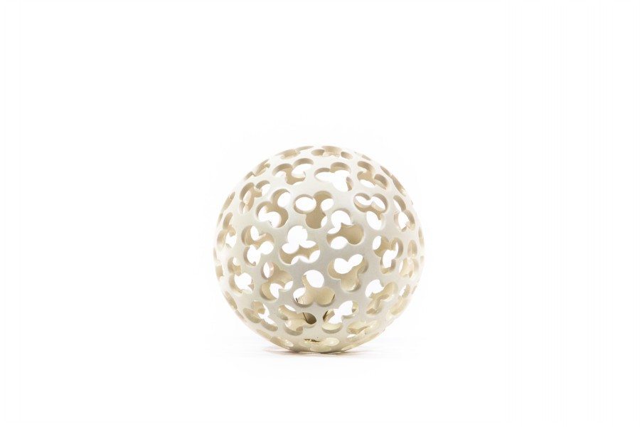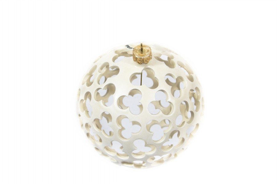 Per la traforatura della pallina, oltre alle diverse ore di lavoro, sono necessari maestria e abilità. Lo spessore dell’argilla e la delicatezza della forma a sfera rendono difficile il processo di lavorazione anche quando l’argilla è alla giusta durezza cuoio. Una volta terminata la fase della traforatura artistica a mano libera, la palla viene cotta a biscotto e successivamente rivestita con la cristallina vetrosa trasparente. In tal modo la cristallina matt sulla terracotta bianca non altera il colore e dona lucentezza all’oggetto. L’ultima fase della lavorazione consiste nella seconda cottura che rinforza la forma. La Palla di Natale è di colore bianco opaco, molto elegante e sofisticato.