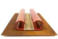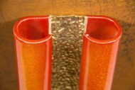 All’interno dell’opera sono presenti delle incisioni arricchite dalla decorazione in oro zecchino a Terzo fuoco. La colorazione esterna ed interna presenta una gradazione su toni caldi con effetti cangianti. Il supporto sul quale è stata istallata l’opera è in acciaio corten. La caratteristica di questo materiale sta nella sua naturale ossidazione, che restituisce tonalità cromatiche calde e intense. Questo tipo di materiale, sempre più spesso viene utilizzato come base per opere d’arte e sculture monumentali anche all’aperto, garantendo una certa resistenza della struttura nel tempo. Il supporto in acciaio, realizzato a sua volta su misura per la scultura ceramica, è dotato di ganci ed è predisposto per essere  subito appeso alla parete.