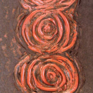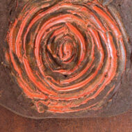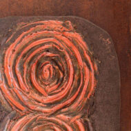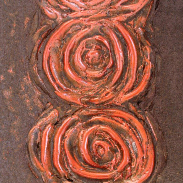 Il pannello in ceramica semirefrattaria è stato modellato e decorato a mano, il decoro richiama un motivo costituito dal ripetersi di spirali, vortici dal colore rosso vivo. La spirale, dipinta o realizzata a rilievo, compare come decoro anche sulle ceramiche e nelle decorazioni parietali già nei tempi antichi. Esistono diverse interpretazioni del significato del decoro a spirale, basato su diverse culture, convinzioni e rappresentazioni. Nell’arte figurativa alla “Spirale” vengono attribuiti significati legati all’idea concettuale dell’artista: emanazione, estensione, sviluppo, continuità ciclica e creazione, espresse dalla partenza della linea da un punto preciso.