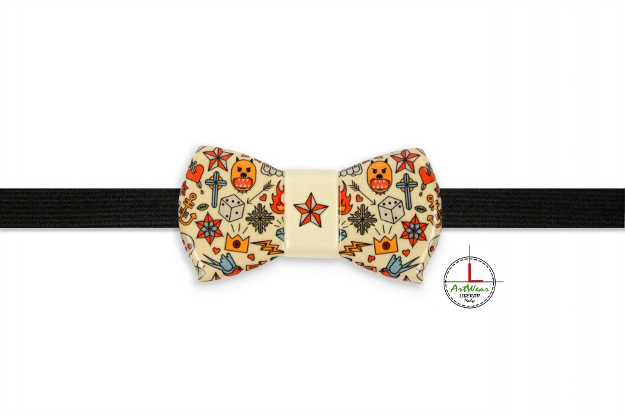 Il design del Papillon è un chiaro esempio di come le nuove generazioni di artigiani vogliano stare al passo con un mondo creativo in rapida evoluzione. I papillon in ceramica, eleganti accessori moda, sono adatti alle più disparate occasioni e garantiscono un look fresco e alternativo sia per l’uomo sia per la donna.La fantasia del decoro “Old School” si ispira a uno dei più antichi stili di tattoo occidentali. Nel decoro del papillon in ceramica si è scelto di rappresentare i simboli per antonomasia del “Old School” ovvero rondini, dadi, croci, frecce, ecc.. La disposizione degli elementi, su lati opposti del papillon è a specchio e nella parte centrale vi è raffigurata una stella, altro elemento tipico dei tatuaggi “vecchia scuola”, simbolo di guida e di protezione