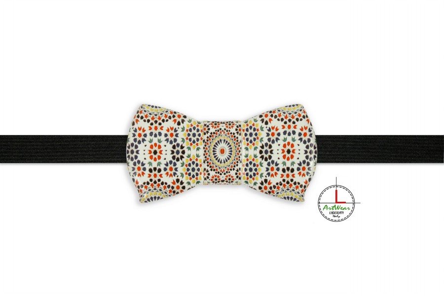 Il decoro del papillon “Maiolic” rappresenta una fantasia decorativa pensata come omaggio alla maiolica italiana. Letteralmente con la parola “maiolica” viene definito un tipo di vasellame caratterizzato da un corpo ceramico poroso rivestito, prevalentemente per immersione, di uno smalto stannifero. Il nome deriva da quello dell’isola di Maiorca, uno dei centri più attivi in tale smercio nel medioevo. I colori classici e gli accostamenti di elementi decorativi danno origine ad un continuo rimando tra tradizione del decoro e attualità dell’accessorio moda, il quale a sua volta garantisce un look elegante e ricercato. Il decoro del papillon è stato realizzato a colori e applicato con la tecnica di stampa digitale su ceramica.
