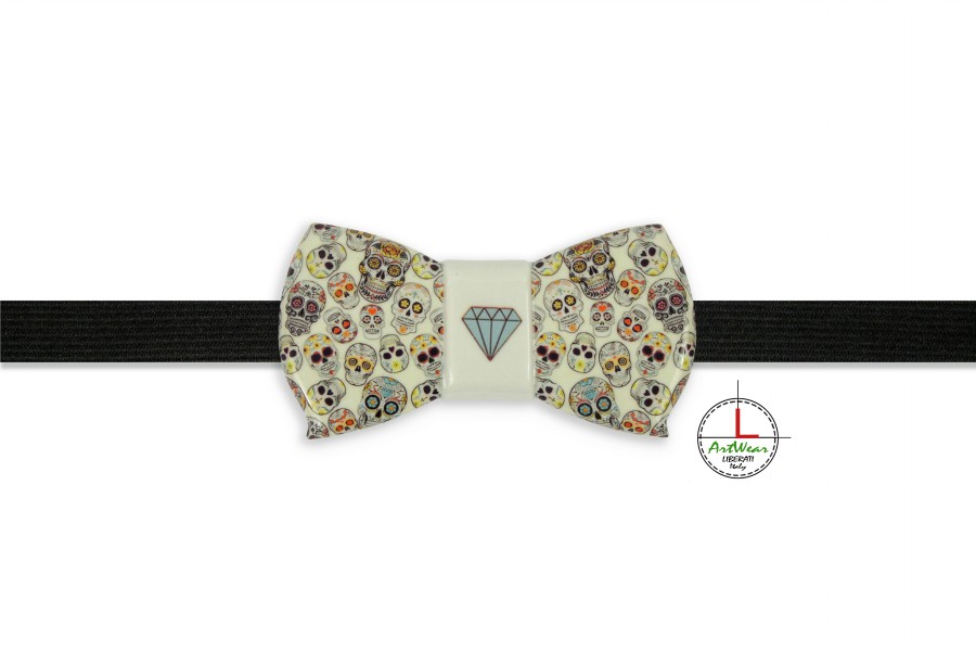 Il decoro del papillon “Teschi Messicani”, detti anche “teschi di zucchero”, fanno parte della tradizione messicana sul culto della morte. Si tratta di un’antica tradizione di esortare la morte tramite l’utilizzo di teschi o scheletri, dipinti a colori vivaci e allegri. Difatti, i calaca (dal messicano “scheletro”) vengono utilizzati come decorazioni durante il festival del Giorno dei Morti in Messico. Le calacas sono considerate figure gioiose, e non macabre: sono spesso raffigurate con abiti festosi, o nell’atto di danzare o suonare strumenti musicali, ad indicare un’allegra concezione dell’aldilà. Il decoro del papillon è stato realizzato a colori e l’applicato con la tecnica di stampa digitale su ceramica.