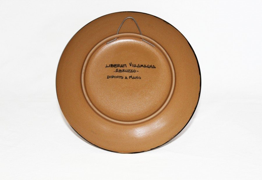 Il Piatto da muro decoro Presentosa verde in ceramica maiolica, realizzato e dipinto a mano con smalti a rilievo, diametro 12 cm; colore principale verde. Il decoro rappresenta la “Presentosa“, gioiello abruzzese per eccellenza, vero capolavoro dell’arte orafa, quasi certamente di origini settecentesche, diventato famoso per la descrizione che ne fa Gabriele D’Annunzio nella sua opera “Il trionfo della morte”. Si tratta di un ciondolo realizzato in filigrana d’oro o d’argento, che contiene una stella formata da triangoli in lamina lucida con la punta rivolta verso l’esterno e nel cerchio centrale, risultante dall’unione delle basi dei triangolini, su un fine intreccio di filigrana, reca un simbolo che dà un significato particolare al monile, rendendolo un vero mezzo di comunicazione visiva.