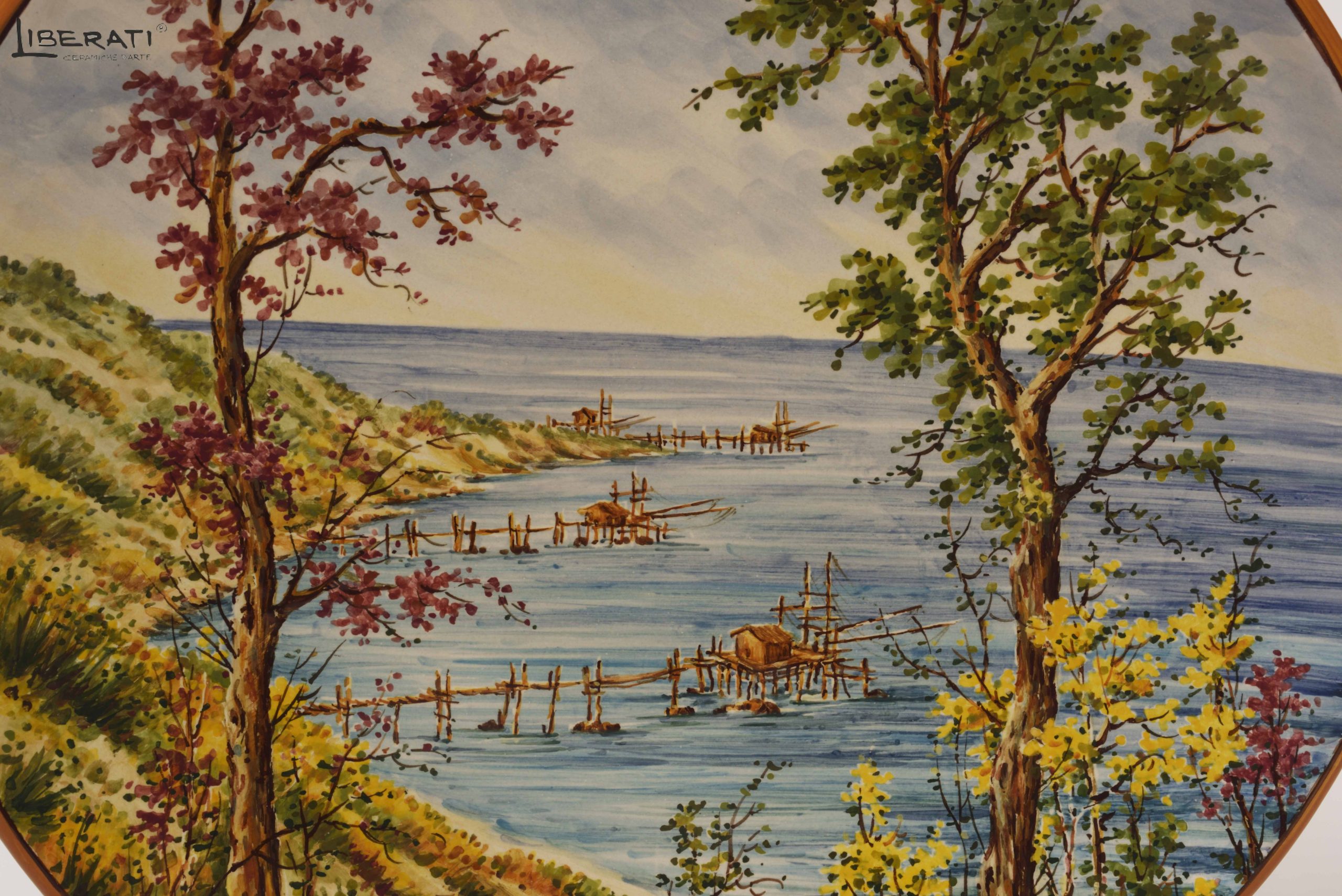 Il piatto  è un autentico capolavoro in ceramica, decorato a mano con la tecnica a pennello. La rappresentazione del paesaggio naturale è una tradizione che risale al XVII secolo, quando i pittori iniziarono a valorizzare la bellezza del territorio attraverso le loro opere. Con il passare del tempo, anche i ceramisti hanno iniziato a decorare i loro pezzi con scenari paesaggistici, sebbene inizialmente in modo semplice e spesso monocromatico. Dal XVIII secolo, i vasai hanno ulteriormente affinato questa pratica, dando vita a decorazioni vivaci e dettagliate su una vasta gamma di oggetti ceramici, tra cui anfore, vasi, piatti e centrotavola.