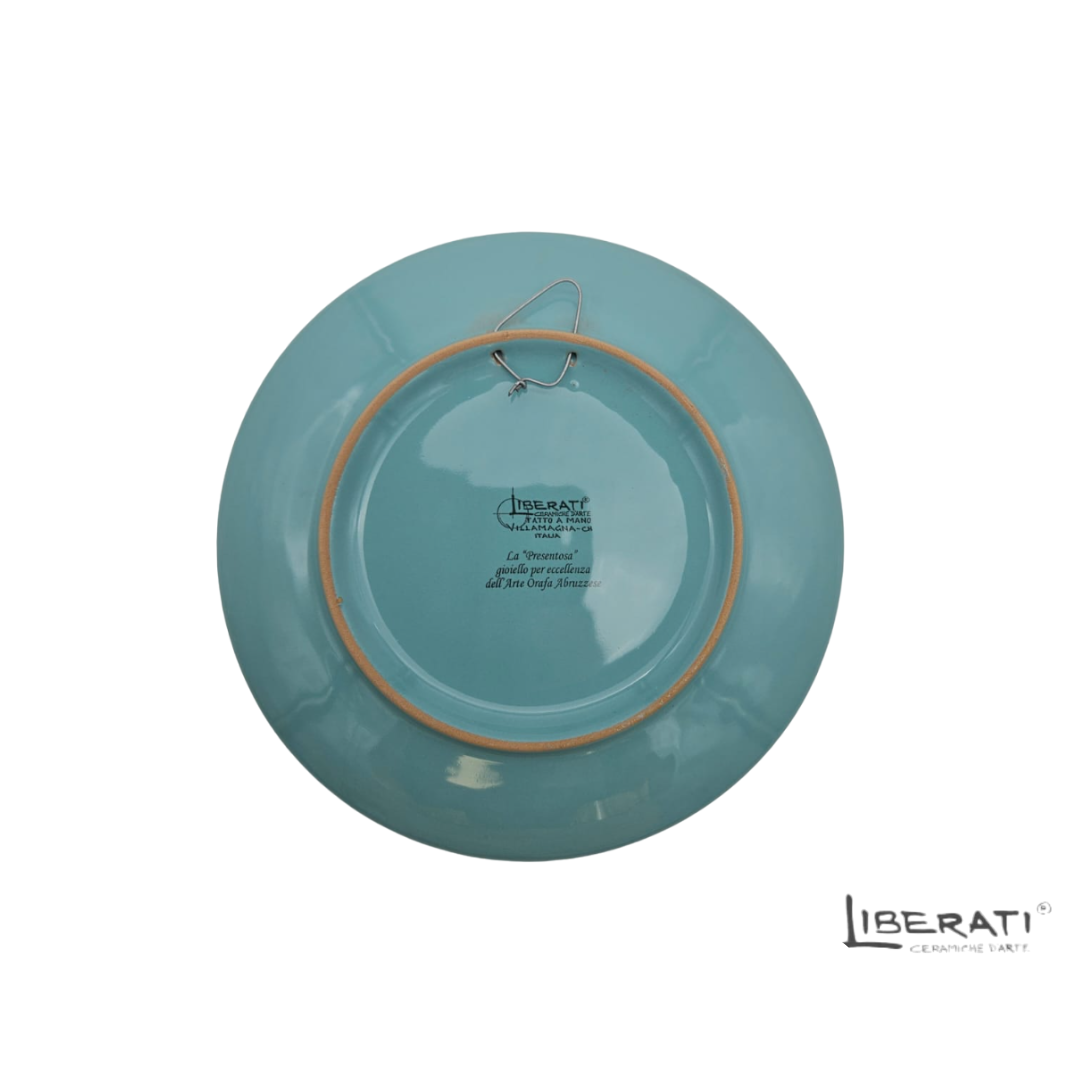 Il Piatto da muro in ceramica verde tiffany con Presentosa è stato realizzato dai nostri ceramisti abruzzesi del laboratorio Liberati con metodi artigianali. Il decoro rappresenta la “Presentosa“, gioiello abruzzese per eccellenza, vero capolavoro dell’arte orafa, quasi certamente di origini settecentesche, diventato famoso per la descrizione che ne fa Gabriele D’Annunzio nella sua opera “Il trionfo della morte”.