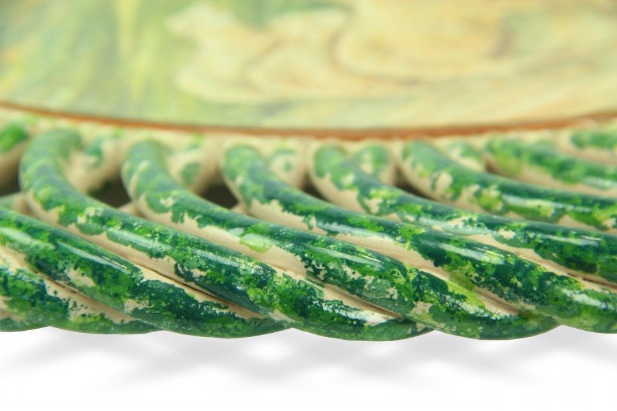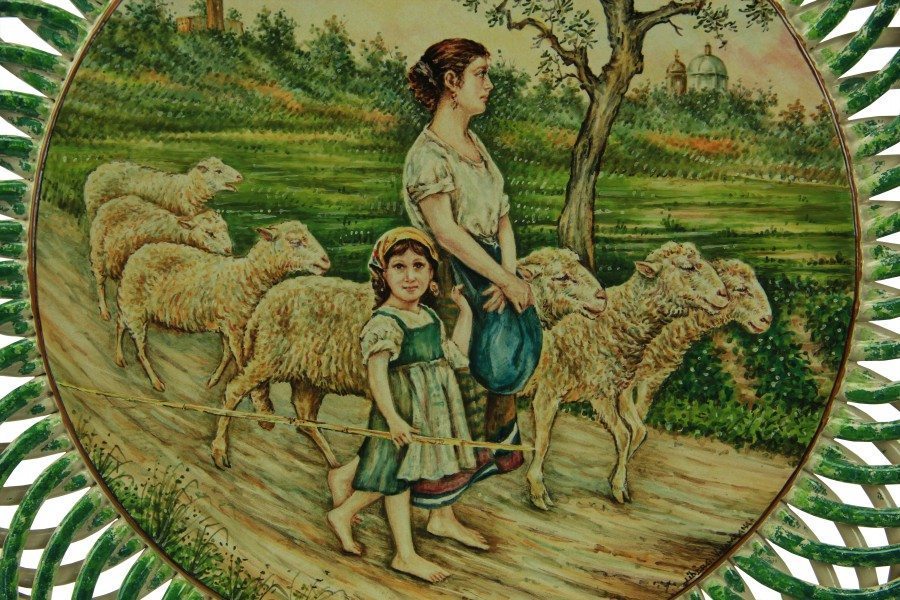 Il piatto in maiolica italiana con bordo intrecciato, è stato interamente foggiato e dipinto a colori a mano con la tecnica di decoro “a pennello”. E’ un omaggio al celebre dipinto di Francesco Paolo Michetti “La Pastorella con gregge“. Il famoso Pittore e Fotografo Abruzzese è nato a Tocca da Casauria (PE) il 4 agosto 1851 e concluse la sua vita artistica a Francavilla al Mare, dove morì il 5 marzo 1929. Tra le frequentazioni di prestigio del noto artista, vi furono Basilio Cascella, Francesco Paolo Tosti, Gabriele D’Annunzio, Costantino Barbella, Matilde Serao, Edoardo Scarfoglio, Francesco Saverio Altamura, Antonio De Nino e Nicola D’Antino. La collaborazione tra Michetti e D’annunzio fu particolarmente intensa sia a livello artistico sia umano protrasse fino al 1904.