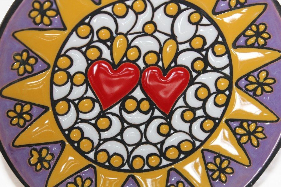 Piatto da muro in ceramica italiana realizzato e dipinto a mano con smalti a rilievo, colori principali bianco e lilla. Il decoro rappresenta la “Presentosa” con 2 cuori nonché il gioiello abruzzese per eccellenza, vero capolavoro dell’arte orafa di origini settecentesche.  Al momento dell’acquisto, al prodotto verrà allegato il Certificato di garanzia che attesta l’artigianalità della lavorazione.