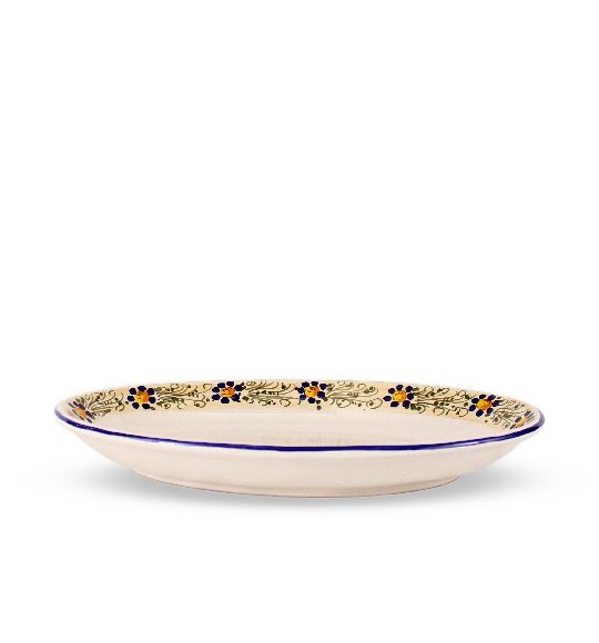 Il Piatto da portata ovale o sperlunga in ceramica è stato realizzato e decorato a mano, con metodi artigianali e con materiali adatti per l’uso alimentare. Il piatto o vassoio da portata in ceramica è disponibile in 4 diverse misure, tipo di decorazione Rustico. Il decoro è formato da una fascia larga posizionata sulla parte interna del bordo. Tutte le fasi del processo di realizzazione del piatto ovale, dalla foggiatura alla decorazione, rispettano la migliore tradizione della lavorazione della ceramica artigianale italiana e i materiali utilizzati sono di altissima qualità.
