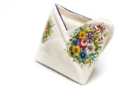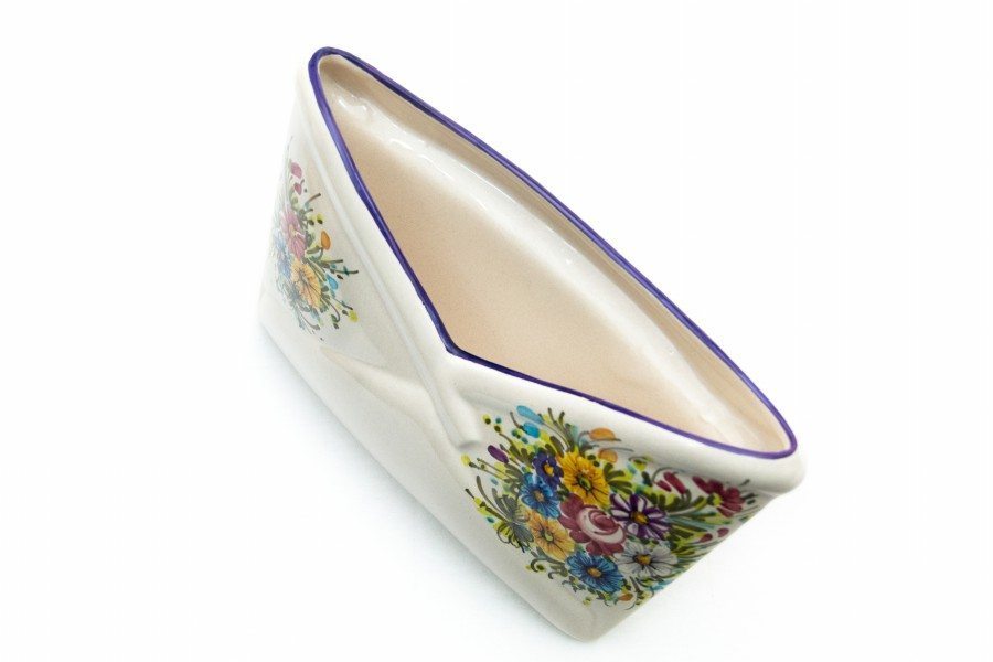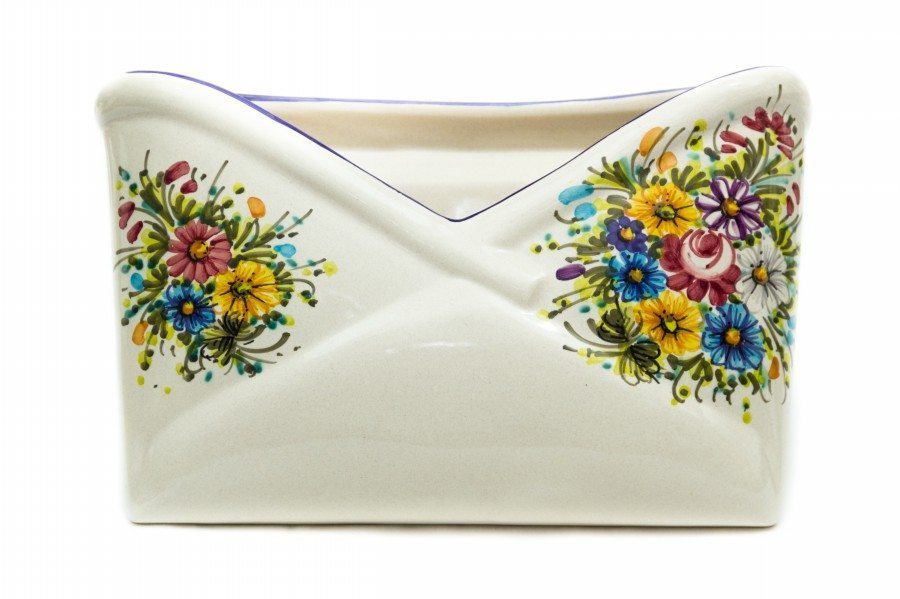 Il Portadocumenti da scrivania a forma di busta da lettere è stato realizzato interamente in ceramica maiolica italiana, con metodi tradizionali e materiali di altissima qualità. L’oggetto è realizzato in argilla bianca, foggiato e rifinito a mano, colore dello smalto bianco antico e decorato a mano con decoro floreale a colori Fioraccio abruzzese. Tutte le fasi del processo di realizzazione del portadocumenti, dalla foggiatura alla decorazione, rispettano la migliore tradizione della lavorazione della ceramica artigianale italiana.