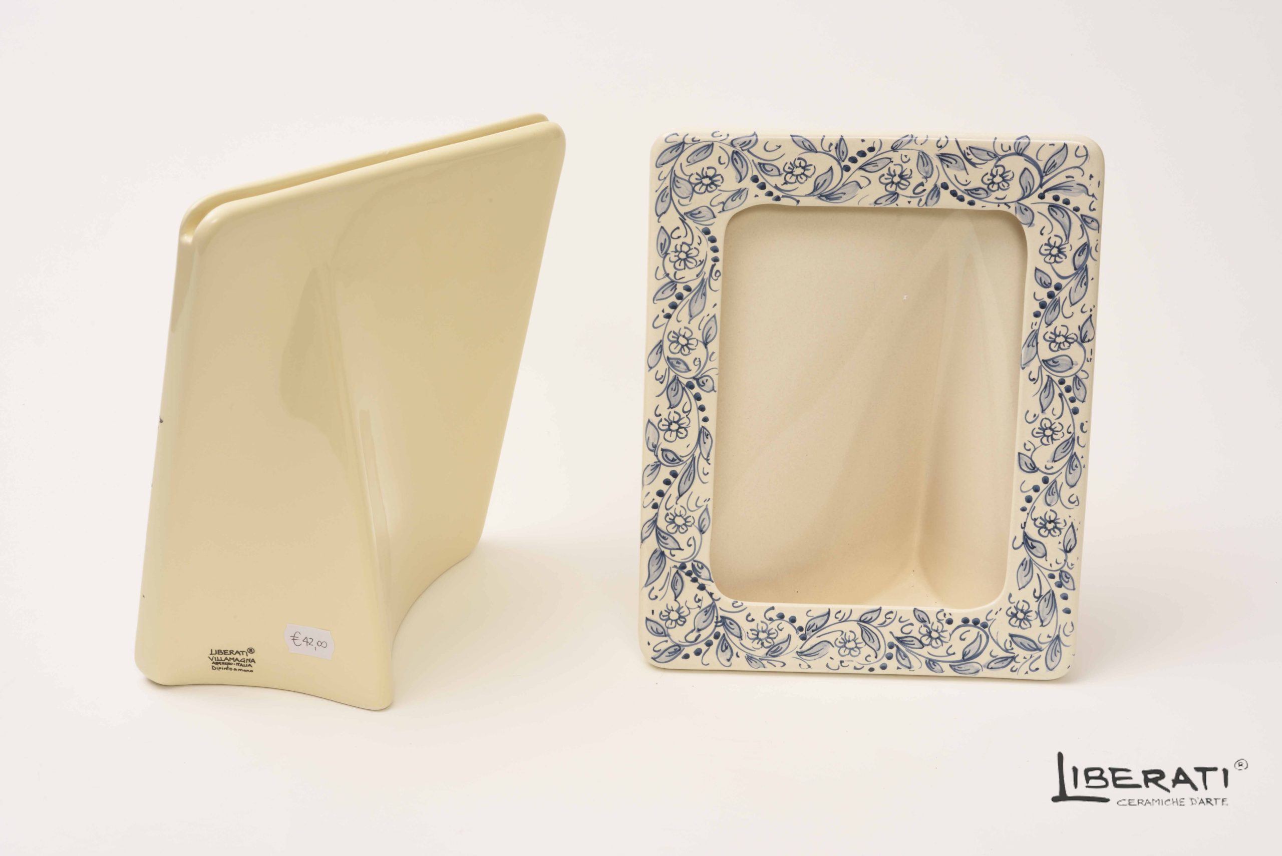 Questo elegante portafoto con la decorazione teate in ceramica è stato realizzato con metodi artigianali nel laboratorio della famiglia Liberati. Il decoro è stato dipinto interamente a mano da esperti del mestiere ed è caratterizzato da una fascia floreale posizionata sulla cornice del portafoto.