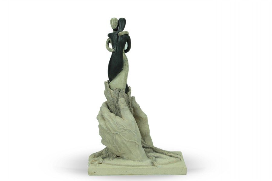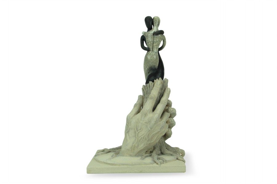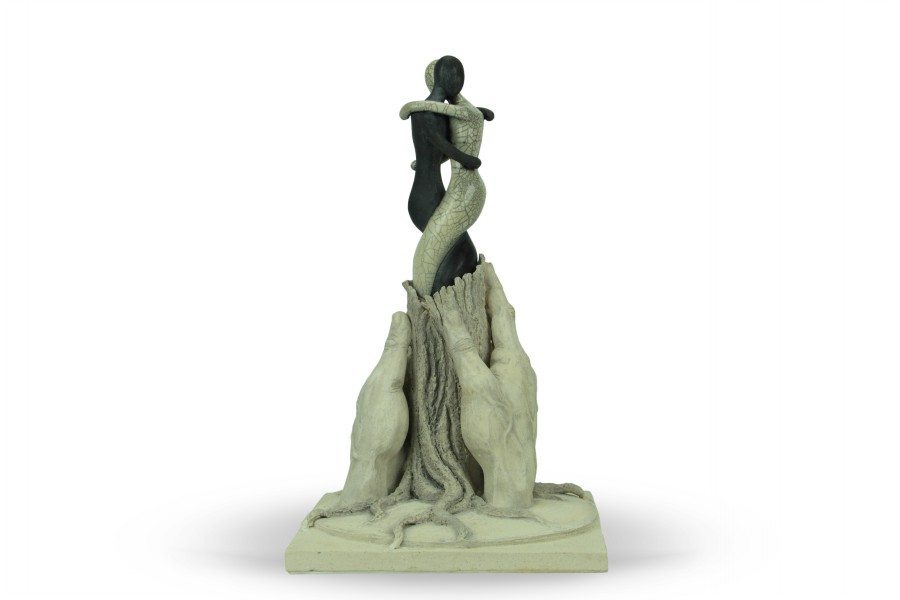 Per la realizzazione dell’opera è stata utilizzata un’argilla refrattaria bianca, che viene lasciata al naturale nella parte inferiore dell’opera, mentre le figure stilizzate sovrastanti sono realizzate in ceramica raku. L’albero e le sue radici simboleggiano la natura primordiale, la grande forza che ha generato la vita. Le due figure che prendono forma dalla linfa dell’albero, con slancio si proiettano verso il futuro verso un mondo nuovo dove la guerra lascia il posto alla pace e all’armonia fra i popoli, si stringono come se l’una non potesse esistere senza l’altra. Uguali e simmetricamente opposte rappresentano l’abbraccio fra i popoli che è mosso da un unico grande sentimento e non conosce distinzione di sesso, razze e religioni. Il tutto è sorretto da due mani forti che con delicatezza avvolgono, proteggono e difendono la vita che ci è stata donata.
