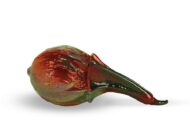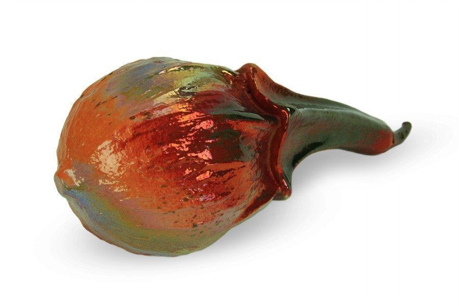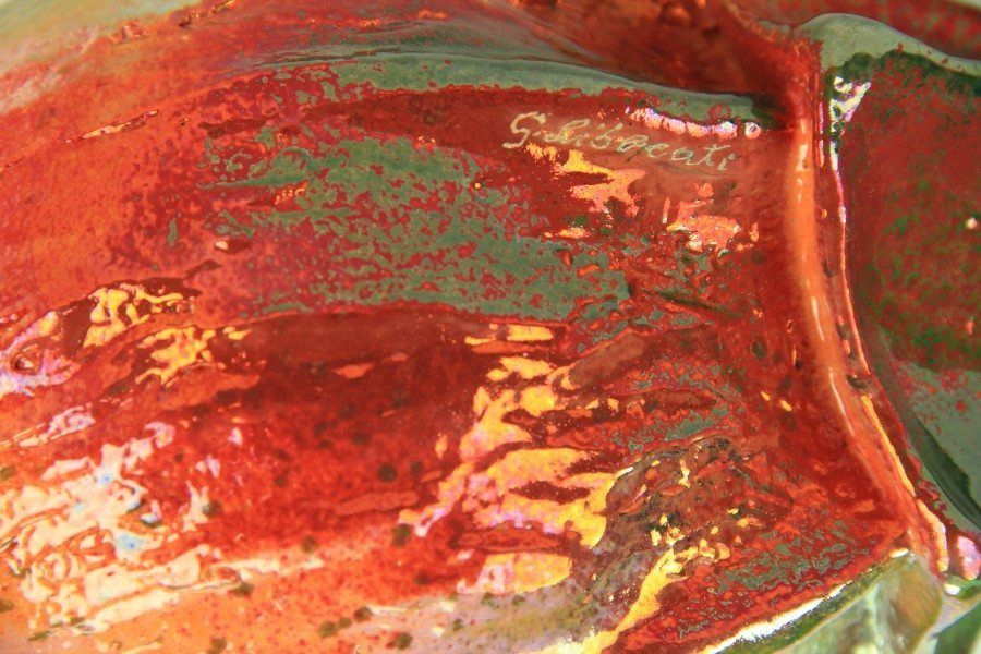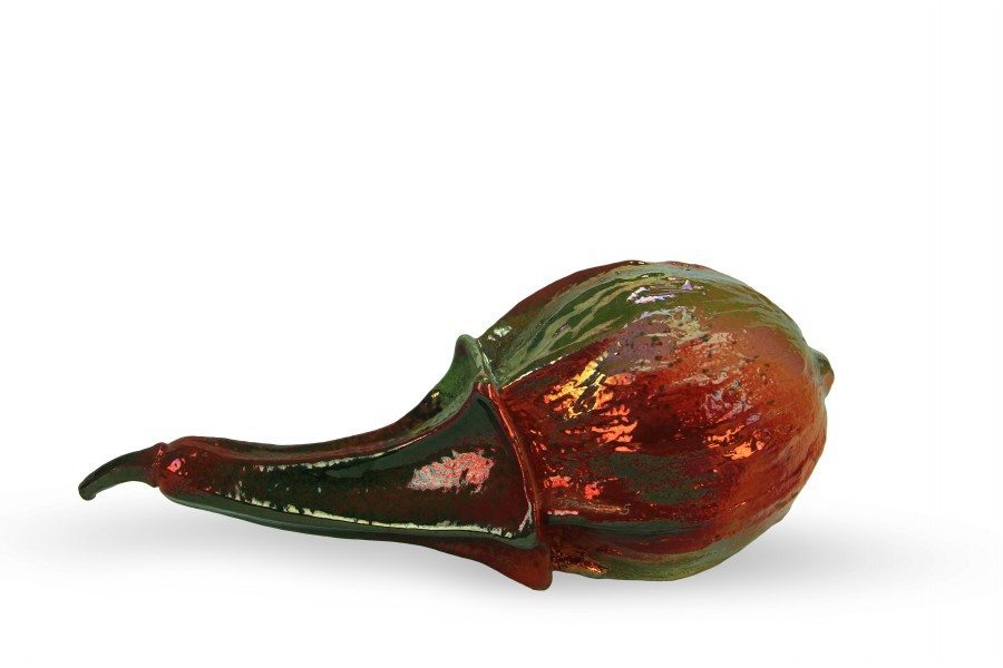La zucca decorativa in ceramica è stata modellata a mano e la finitura realizzata con la tecnica riflessi, quest’ultima è una lavorazione caratterizzata delle sovrapposizioni di smalti, di diverse caratteristiche e colori. Nel forno a gas, indispensabile per questo tipo di lavorazione, durante la cottura vengono indotte delle riduzioni di ossigeno che permettono agli smalti di creare delle iridescenze ed effetti “specchiati” molto particolari. Con questa tecnica di lavorazione si ottengono sulla ceramica dei riflessi metallici singolari e dall’effetto sgargiante e cangiante. Per sapere di più su lavorazioni e decori speciali eseguiti dal maestro Giuseppe Liberati è possibile visitare la pagina Lavorazioni del nostro sito.