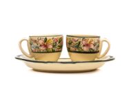 Il servizio caffè in ceramica tête-à-tête è realizzato e decorato a mano, con metodi artigianali e con materiali adatti per l’uso alimentare. Il servizio da caffè tête-à-tête è per 2 persone, composto da: 2 tazzine da caffè e vassoio in ceramica; tipo di decorazione Orchidea a colori. Tutti gli oggetti che compongono il servizio sono stati realizzati in argilla rossa, foggiati e rifiniti a mano, colore dello smalto avorio.