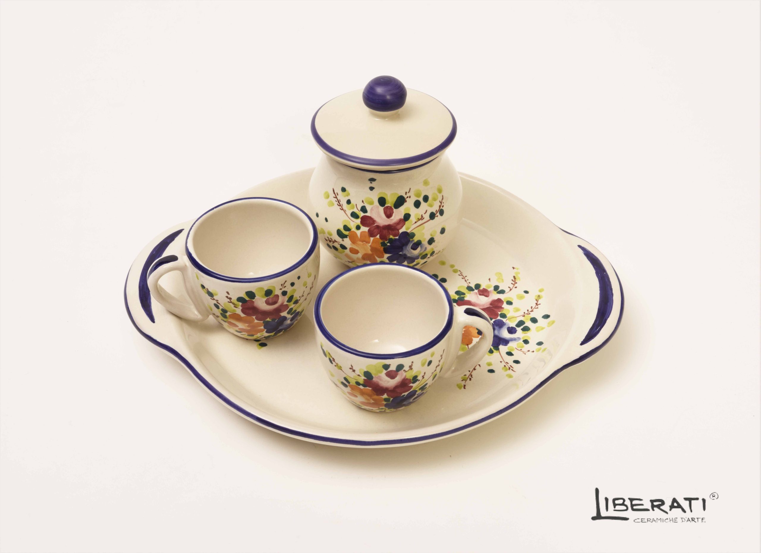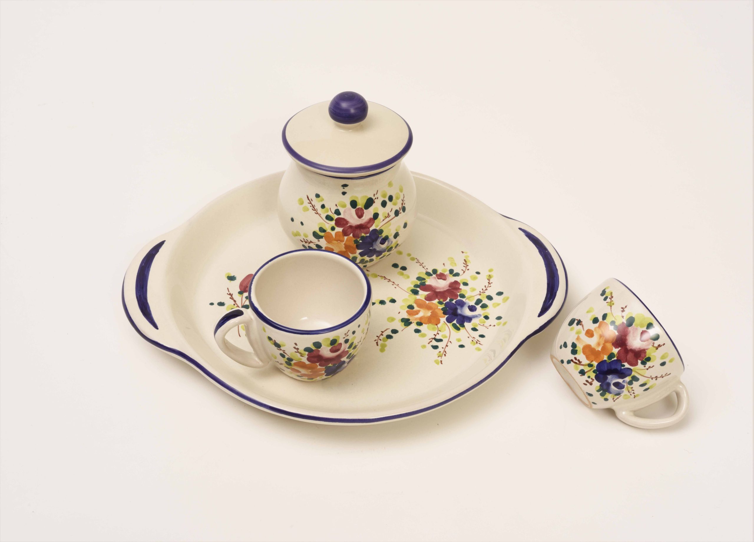 La decorazione floreale presente su questo servizio da caffè viene chiamata rosaspina e fa parte di uno stile decorativo tipico della tradizione abruzzese che si contraddistingue per un mazzetto con tre roselline di colore blu, arancio e rosso ceramico, arricchito da rametti sul marrone e boccioli dalle tonalità verdi. Per ogni oggetto, solitamente ceramica funzionale di arredo casa e per cucina, il decoro floreale della rosaspina viene ridimensionato proporzionalmente alla forma dell’oggetto stesso.