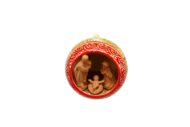 La sfera con Presepe natività incorporato è stata realizzata in ceramica artigianale e decorata a mano. La superficie della sfera è interamente smaltata e dipinta a mano a colori con la tecnica a pennello. La Sacra famiglia è rappresentata dai tre personaggi: Giuseppe, Maria e Gesù bambino, realizzati in terracotta rossa, non smaltata, posizionati all’interno della sferra su un letto di pietroline. Il gancio in ceramica permette di appendere la sfera sull’albero o con un reggisfera. La sfera con Presepe natività può essere posizionata anche su una superficie piana, poggiandola su un apposito anello che sarà fornito al momento dell’acquisto.