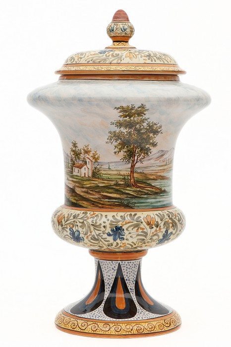Il vaso in ceramica da farmacia è stato foggiato e decorato a mano con paesaggio tradizionale, arricchito con fascia ornata sul coperchio e sulla bombatura. Il manufatto è stato interamente realizzato a mano con metodi artigianali nel rispetto della tradizione della ceramica abruzzese. Il decoro curato nei minimi particolari è il frutto di una consolidata esperienza nel settore dell’artigianato artistico italiano.